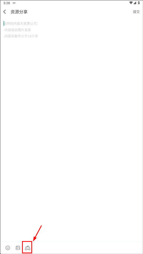 3、进入资源分享后,输入文字内容,然后点击下方“游戏手柄”图标;