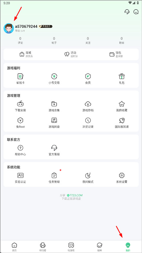 1、首先打开7723游戏盒,进入后点击右下角“我的”,接着点击左上方头像;