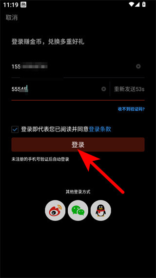3、在登录界面,输入手机号码,点击获取验证码,输入收到的验证码。