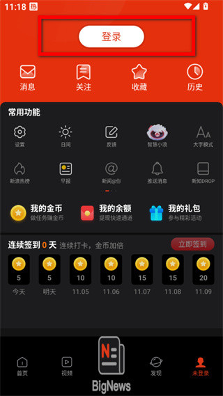 1、在新浪新闻首页,点击右下角未登录选项,进入个人功能页面。