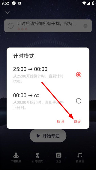 4、进入白噪音设置界面,可选择嘀嗒声、蟋蟀声等音效,还能调整音量,选好后点击确定,为专注计时添加对应的背景音效。