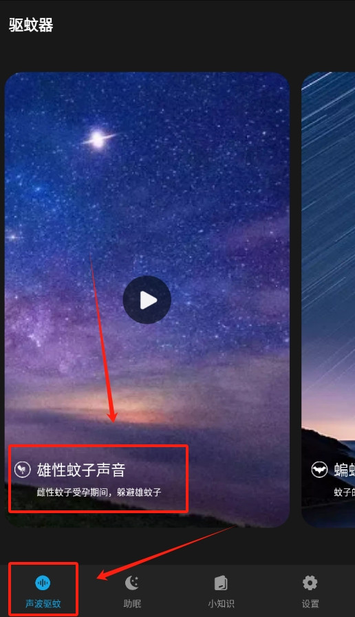 1、 打开驱蚊神器软件,进入首页,你会看到 “声波驱蚊” 选项,点进去就能听到雄蚊子的叫声。