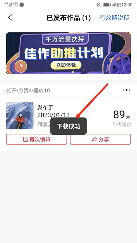 5、返回作品界面,显示“下载成功”,视频已成功保存到相册。