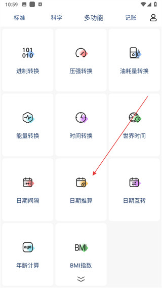 2、在多功能功能页面找到日期推算选项,点击进入日期推算页面。