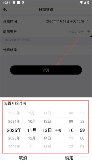 3、在日期推算页面点击开始时间,选择起始日期和时间后点击确定。