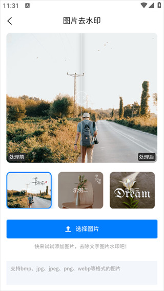 4、点击选择照片,选择完成后点击一键去水印就能完成啦。