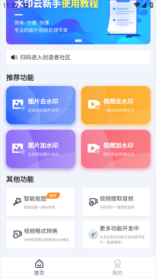 水印云是一款实用的摄影美化类视频水印处理工具软件。水印云官方手机版软件能够快速去除掉视频中的各种水印,并且操作十分简单,各种功能通俗易懂,就算是小白用户也可以很好的使用。除此之外,水印云软件还可以让用户选择并添加自定义的图像或文字水印到他们的视频当中,可以调整水印的大小、位置、透明度和样式等。水印云官方手机版软件还能够支持批量添加水印,让用户可以一次处理多个图像,提高效率。感兴趣的用户赶快来下载吧!