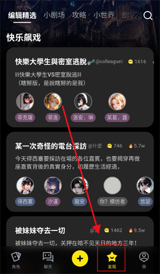 2、在【发现】栏目中,有跟多不同类型的角色和故事,大部分都是用户自己编辑的