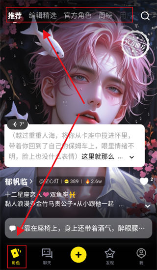 1、在【角色】栏目中,有官方推荐的角色,还有排行榜方便你与人气角色聊天