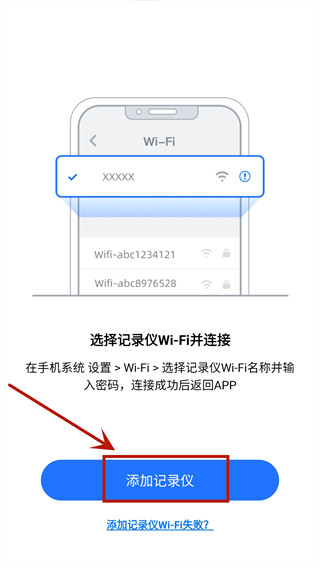 3、在手机设置中打开WiFi并选择记录仪的WiFi名称,连接成功后可以在app内进行添加。