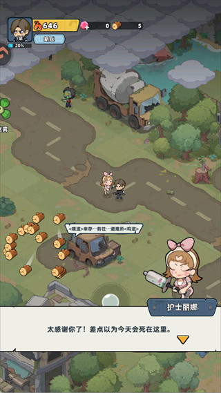 成功救援护士丽娜后,可获得其加入小队,同时场景中会出现资源(如木材),丰富小队成员与资源储备,助力后续生存。