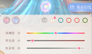 点击色盘按钮,可在【新色盘模式】和【自定义色盘模式】之间进行切换;自定义色盘开放斑斓值、鲜亮值及虹彩值三个维度,拖动对应维度的滑杆,即可自由调节颜色,进行更加多样的幻色创作。