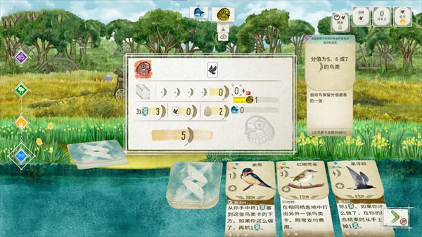 举例来说,「歌带鹀」若处于栖息地的最右侧,它就能自行飞往其它栖息地。游戏过程中,玩家可以灵活调度「歌带鹀」的位置,从而获得更多的资源。