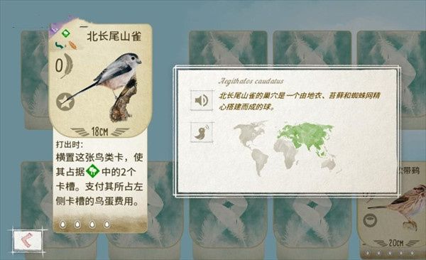 制作组还在游戏中添加了鸟类的叫声和科普介绍。当玩家打出卡牌时,这些音频内容就会被自动触发。在玩家思考的同时,保护区中的鸟类也会时常鸣叫。伴随着舒缓悦耳的音乐,能给人一种舒适安逸的感觉。