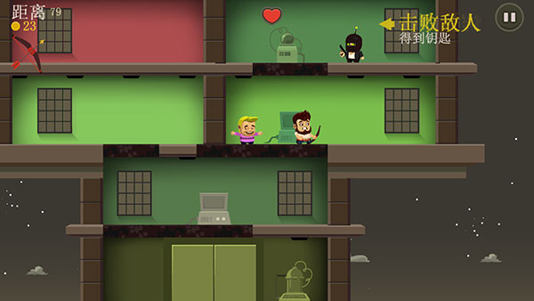 3、一手操控猛烈撞击,游戏让大家体验到了只需一手操控也能感受猛烈撞击的快感,刚开始贴心的新手教程也足矣让玩家一目了然,只需上下滑动屏幕,便可操控这位大胡子上下跳跃来回穿梭撞击在各个楼层之间,并在躲避敌人的攻击同时攻击敌方解救人类。