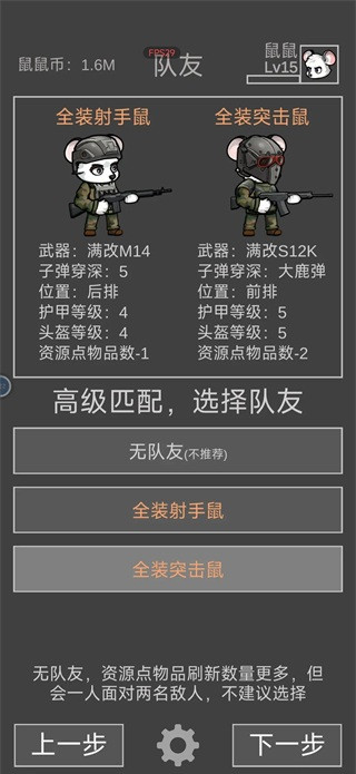 最后是重点来了,队友选择突击鼠鼠,可以的话选择看广告刷个紫色以上的鼠鼠,能抗能打,突击鼠最好的是带鹿弹达姆弹突击鼠。