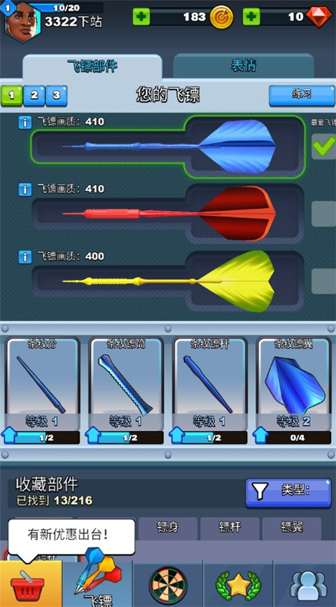 2、丰富的个性化装饰道具,可打造独特的飞镖和角色形象。
