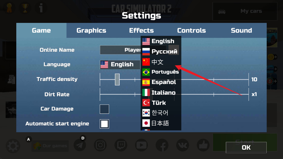 1、进入汽车模拟器2后,点击左下角的齿轮图标进入【设置】。