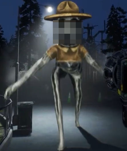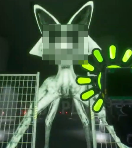 5、右侧是戴着黄色帽子的管理员变异者,左侧是之前视频中出现过的微笑猫,不过造型感觉有点奇怪,给人一种似曾相识的感觉,好像是在后期制作中添加了一些斑点。